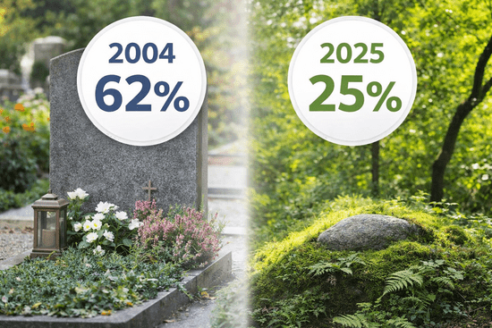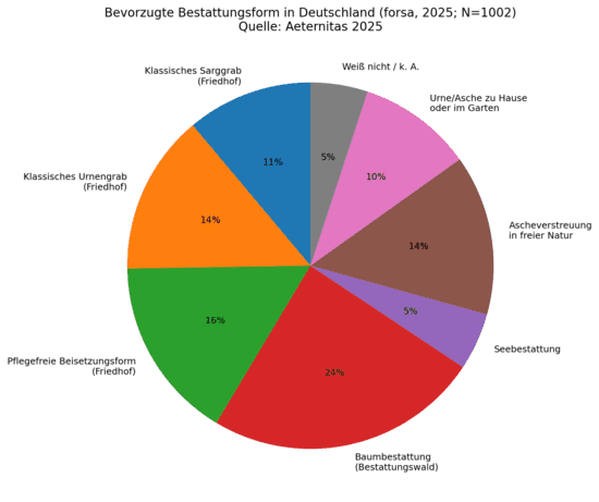 Langfristige, repräsentative Befragungen für Gesamtdeutschland zeigen jedoch eine deutliche Veränderung der Wünsche. Während im Jahr 2004 noch 62 % der Befragten eine klassische Grabstätte bevorzugten, lag dieser Anteil im Jahr 2025 nur noch bei etwa 25 %. Diese Werte beruhen auf wiederholten Studien der Institute TNS-Emnid und Forsa im Auftrag der Verbraucherinitiative Aeternitas und beziehen sich ausdrücklich auf die Bevölkerung in Deutschland insgesamt. Die Entwicklung verdeutlicht veränderte Lebensrealitäten, etwa größere Mobilität, kleinere Familienstrukturen sowie unterschiedliche Vorstellungen von Erinnerung und Grabpflege.